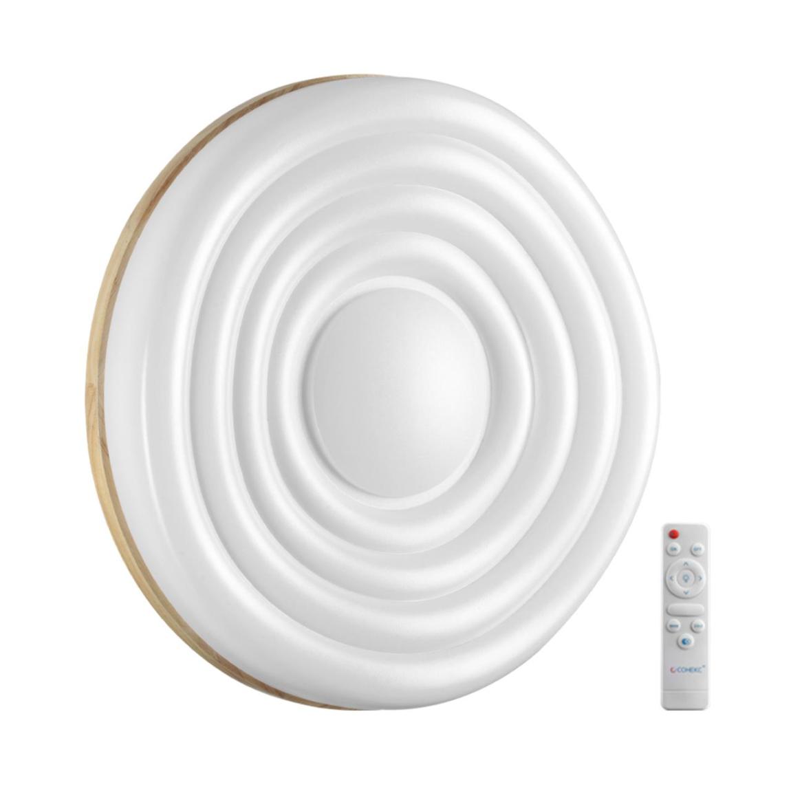 Светильник 7674/DL линии FASS WOOD состоит из металлического основания (базы) и пластикового рассеивателя. Материал рассеивателя — высококачественный пластик марки PMMA 2.0 белого цвета с глянцевой поверхностью и рельефной структурой. Пластик обеспечивает светильнику равномерное рассеивание и хорошее светопропускание. Форма плафона: круглая, декорирована ободом из натурального дерева. Степень защиты IP43 позволяет использовать светильник в определенных зонах влажных помещений. В комплект входит заменяемый LED- модуль с линзами мощностью 48 Вт, соответствующей лампе накаливания 440 Вт, а также пульт ДУ (с креплением на стену), с помощью которого осуществляется плавное изменение цветовой температуры в дипазоне 3000—6000 К, изменение яркости, переход в режим переключения теплого/белого/холодного/ночного света. Светильник имеет функцию памяти.