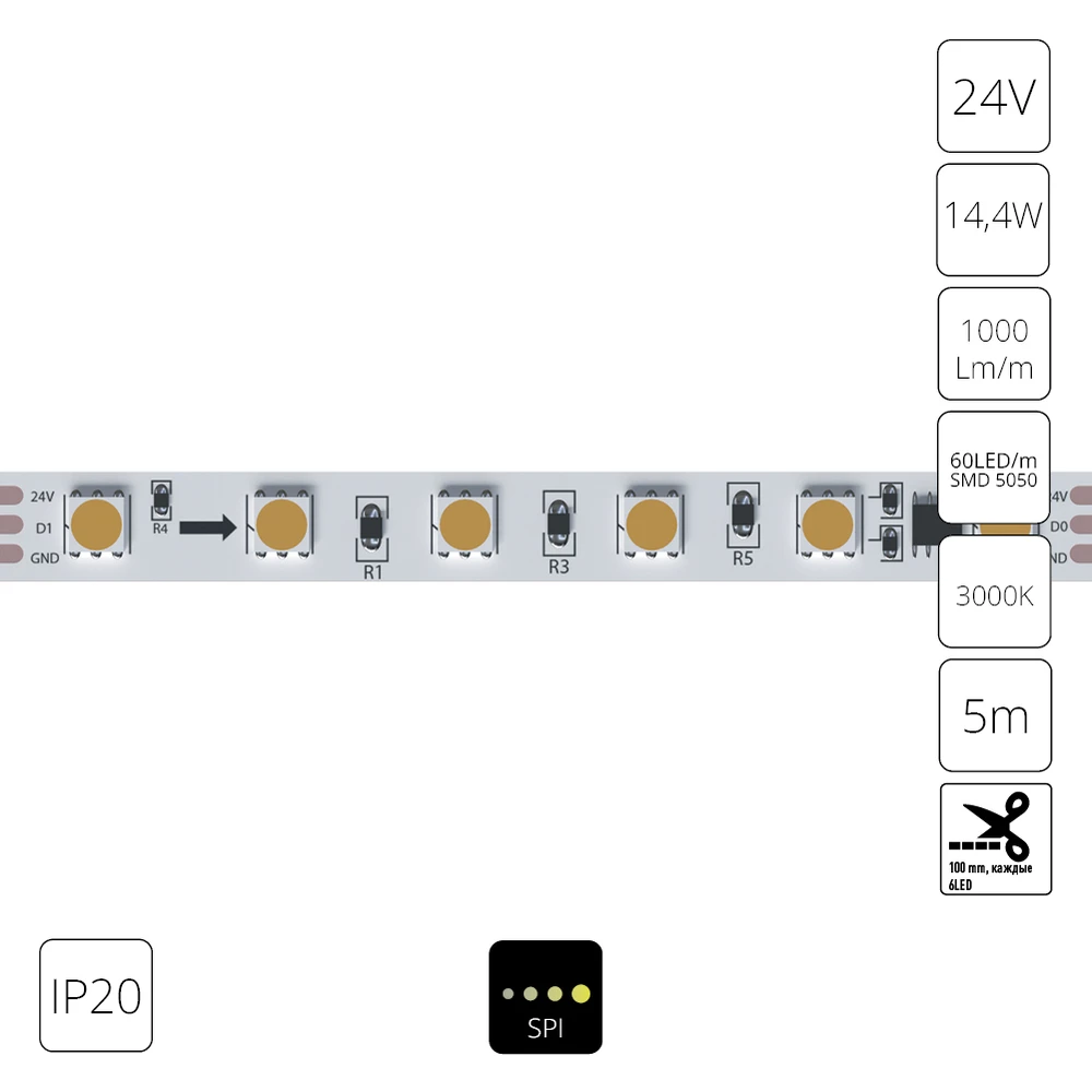 Светодиодная лента 24V 14,4W/m 3000К 5м IP20 Arte Lamp SPI A2406010-03-3K
